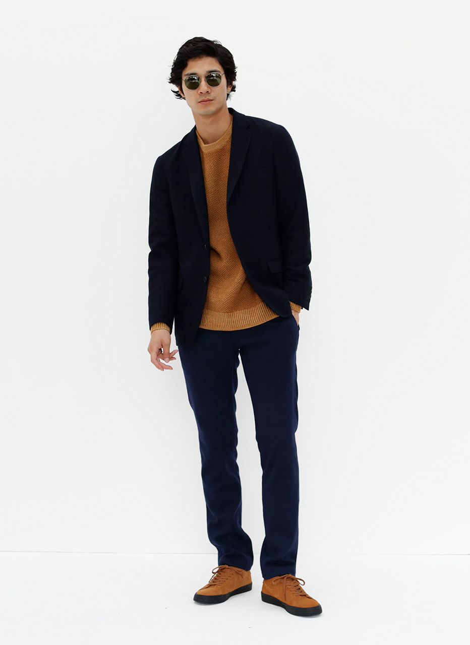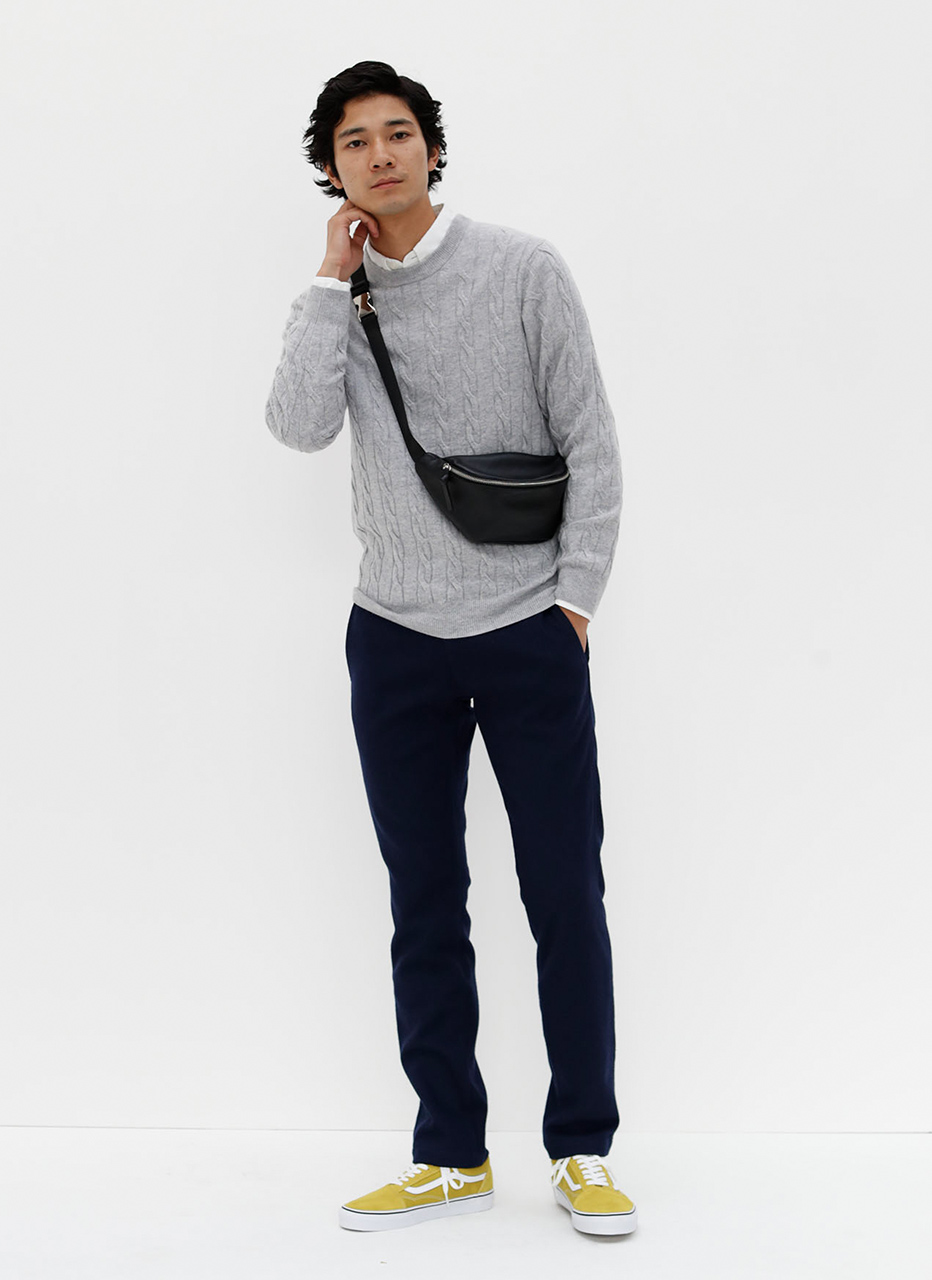 フラノストレッチ素材を使ったパンツ。上品かつリラックスしたはき心地で、今季のローテーション入り間違いなしの一本。ケーブルニットにスニーカーというスクールテイストの着こなしに、大人らしい落ち着きも与えてくれるのだ。