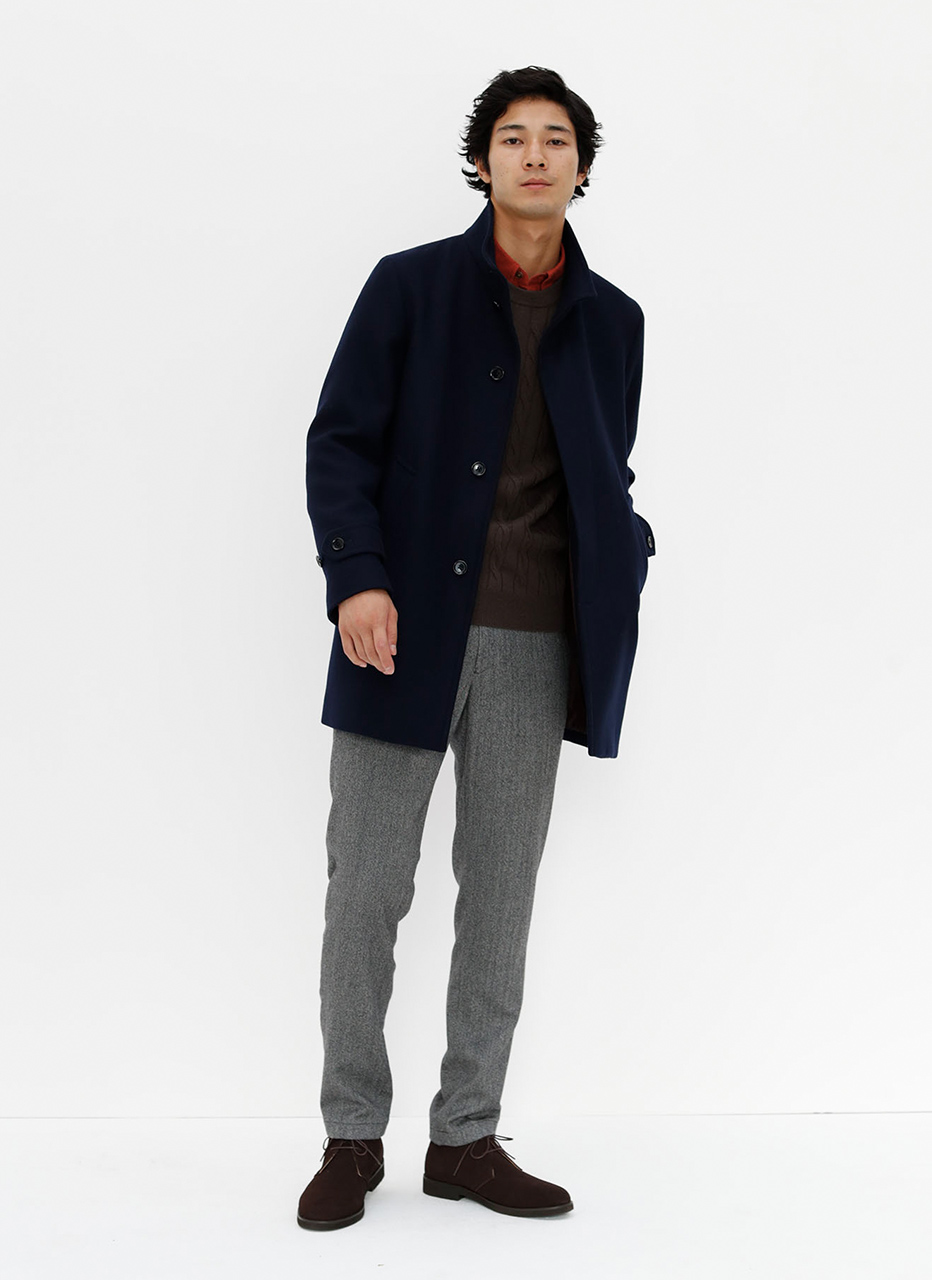 ネイビーの立ち襟コートに茶のニット。通常ならば白シャツをインナーに合わせたくなるが、たまにはこんなレンガ色のシャツを。少々凝ったカラーリングだけど、ぜひトライしてみてほしい。