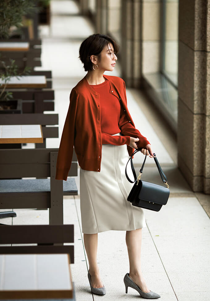 着回し力や汎用性に優れたベーシックなセットアップ。どうしてもシンプルになりがちなスタイルには、発色の良いバッグを。合わせるだけで、ぐんと洒落感がアップ!