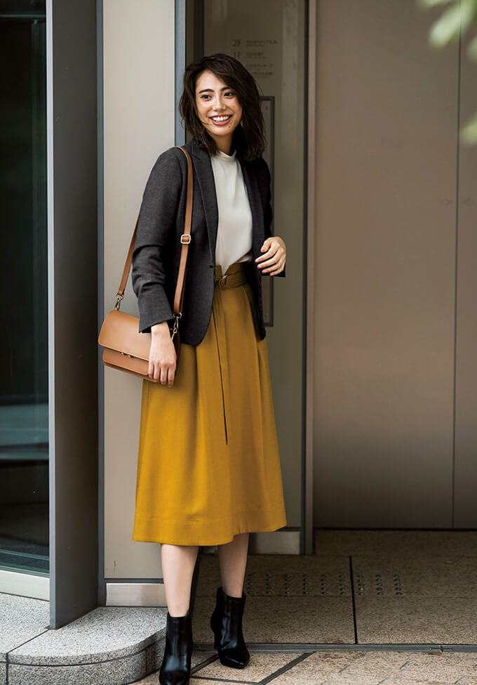 こっくりとした秋色マスタードのフレアスカートで、ジャケットスタイルをクラシカルな装いに。ブラックのショートブーツがコーデの引き締め役。