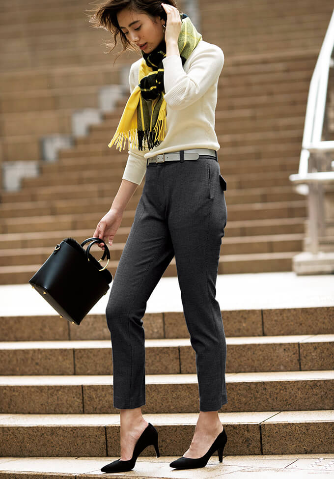 プレーンニットとのシンプルなコーディネートに合わせたのは、今季トレンドのイエローが効いたチェックストール。1点投入するだけで華やかな印象に。