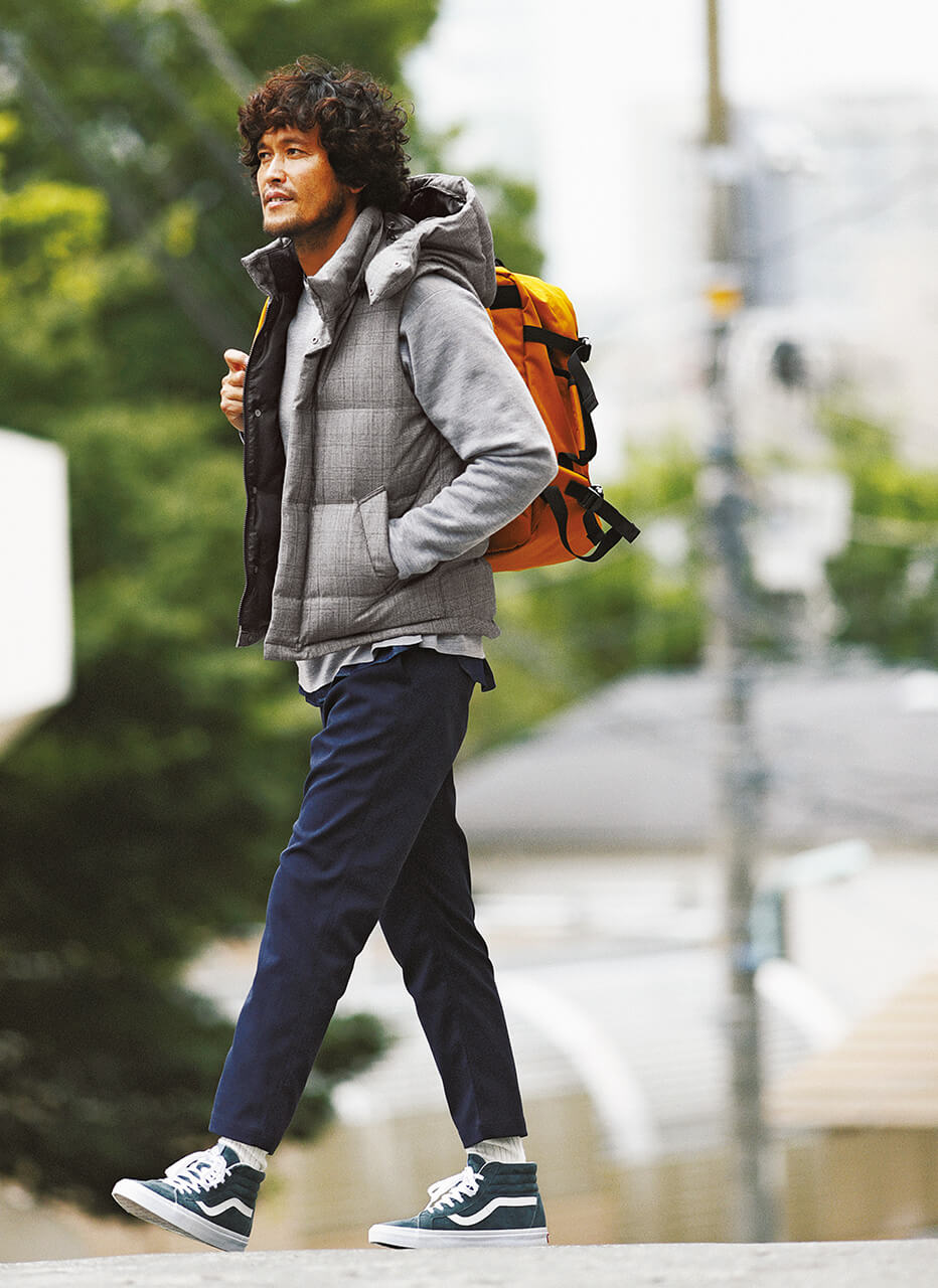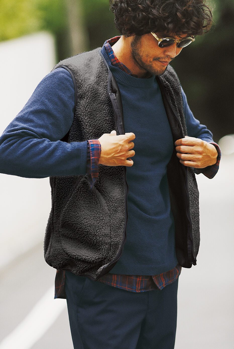 ライナーはポリエステル素材のボアのベスト。例えば、クルーネックのニットにチェック柄のシャツをインナーに合わせてみると、アウトドアテイストを感じさせる着こなしが完成する。