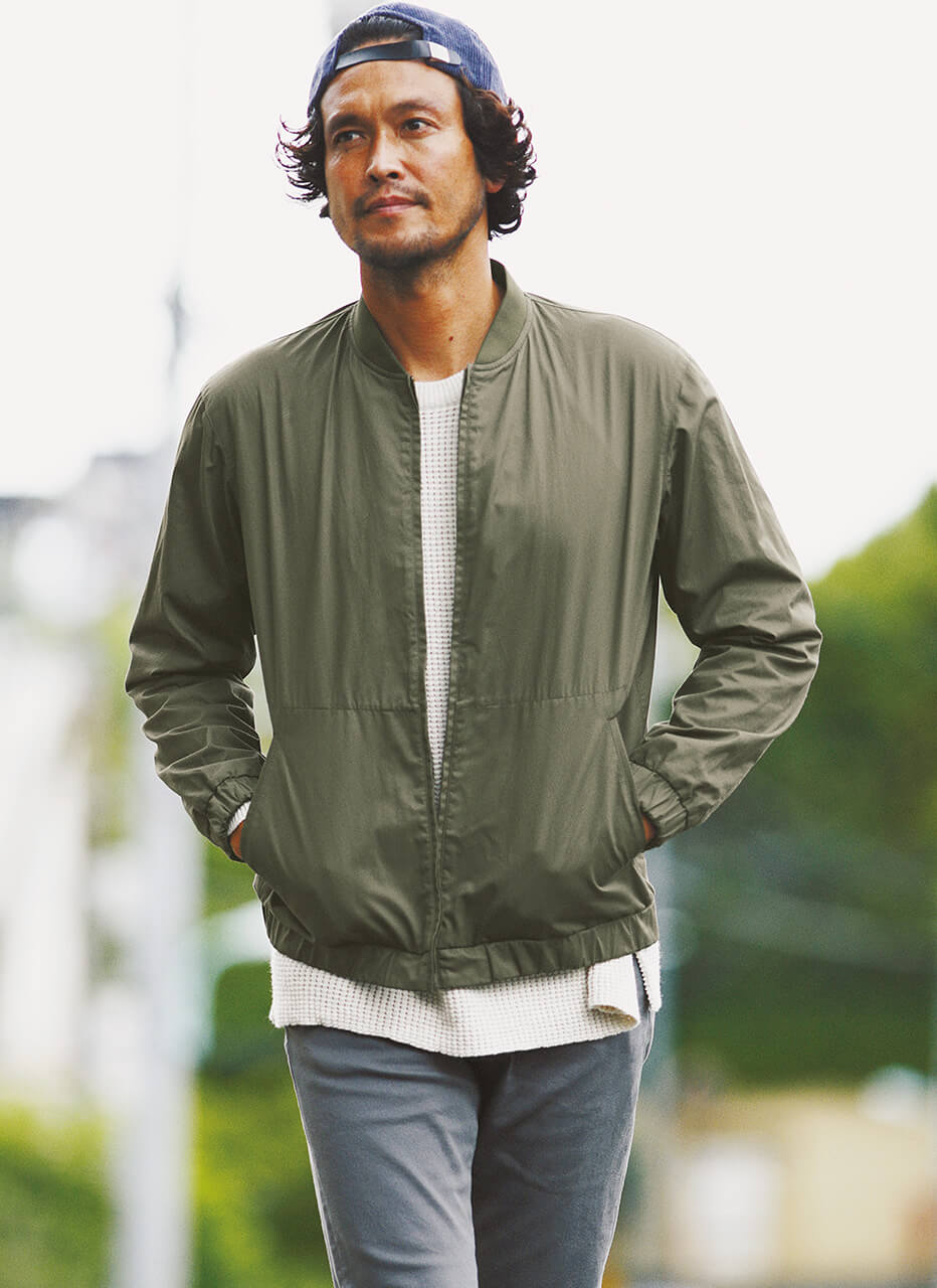 中綿なしで表地に「タイプライター」素材を使用したフライトジャケット。繊維長の長い高級綿を使用し、肌離れ良く仕上げた素材だ。この時季打ってつけのアウターに仕上がっている。
