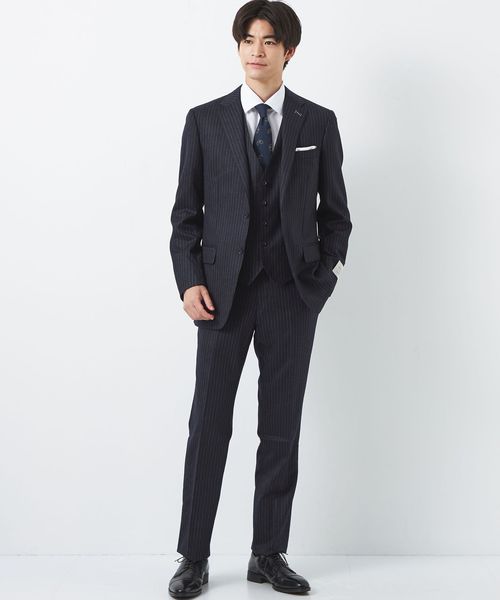 英国的なチョークストライプ柄を活かして、同素材のジャケット&ベストと合わせたスリーピースの着こなしがおすすめ。