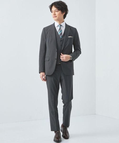 同素材のベストをプラスした3ピーススタイルでは、より格上げしたコーディネートが完成します。