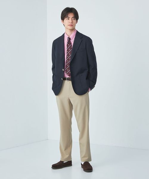 ぐっと雰囲気を変えてボタンダウンシャツやストライプタイを合わせた、トラッドな着こなしも楽しめます。