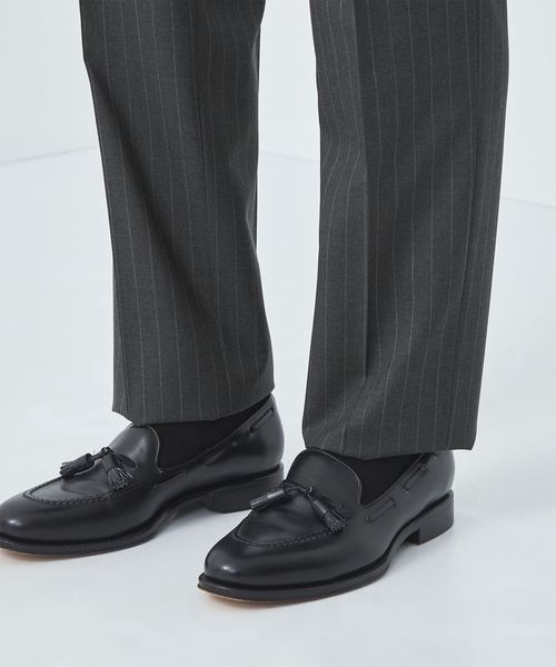 よりきっちり感を演出するなら紐靴を、軽快さを出すならローファーを、足元で全体のバランスを調整するのがおすすめ。
