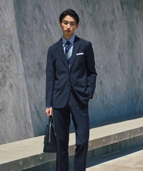 ビジネスシーンでは同素材パンツとのスーツスタイルがおすすめ。
