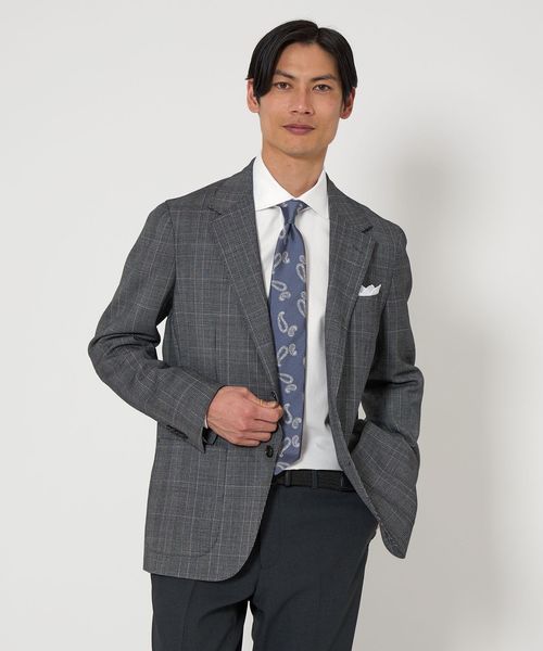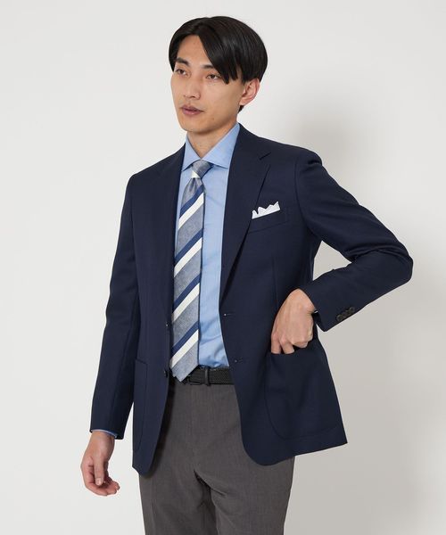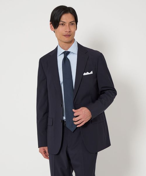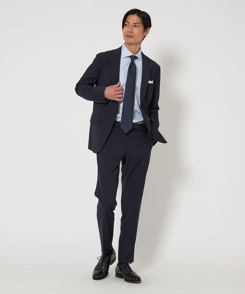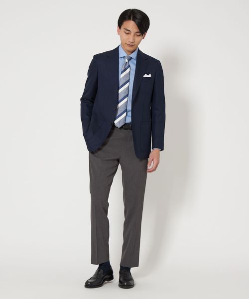 ベーシックなダークスーツはもちろん、凹凸のある表面感のジャケットなどにも合わせやすい1着。