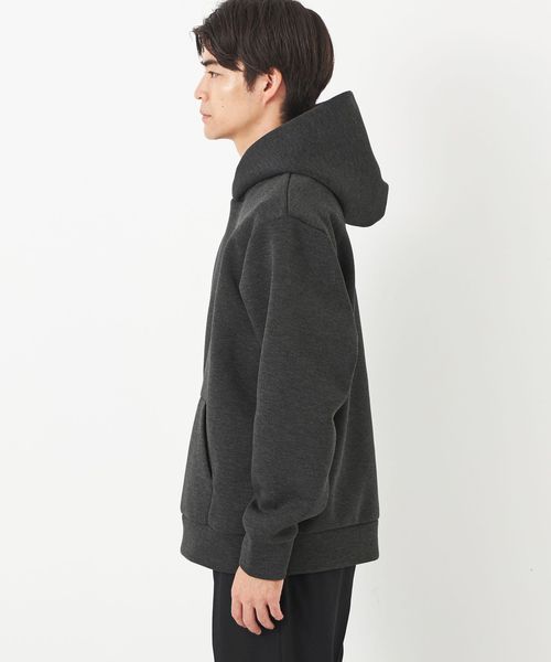 リサイクル素材を使用したストレッチ性が高いニット生地を、ダンボール状の気室空間のある3層構造に形成することで、肉厚な質感ながら軽く、デッドエアが発生しやすいニット生地構造を実現。