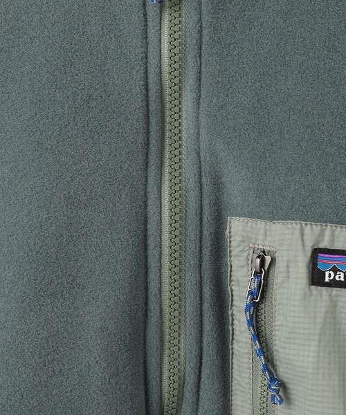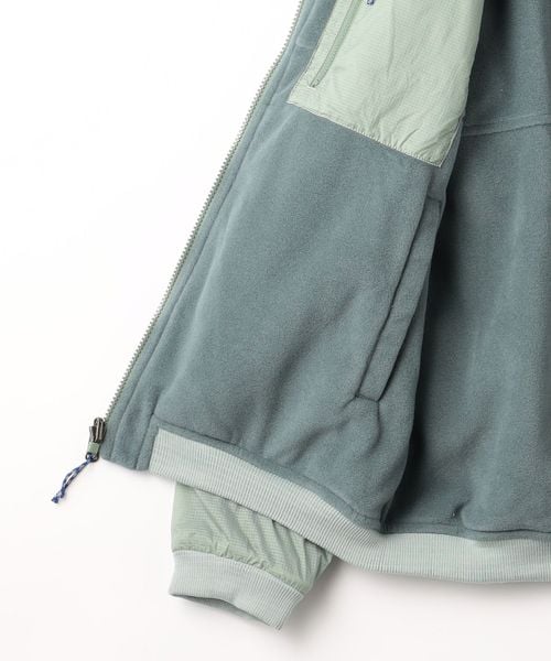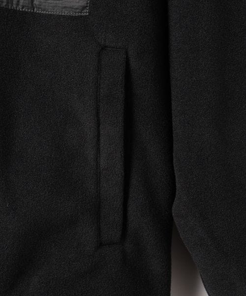 リサイクル・ポリエステルの軽量なベロア・フリースを使用した裏面にはハンドウォーマーポケットが2つと、左胸にジッパー式パッチ型ポケットが1つ。