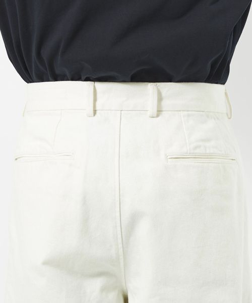 ウエストボタンの比翼仕様、バックの両玉縁ポケット、サイドのスラントポケットとカジュアル素材であるデニムにスラックスディテールを搭載。