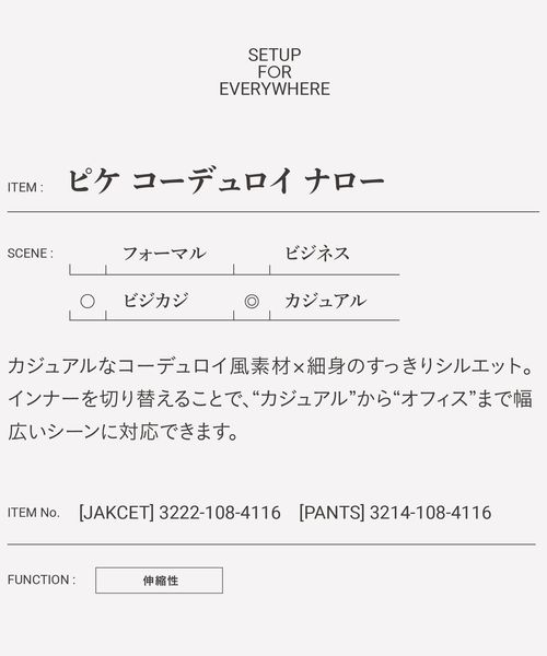 同素材ジャケットと合わせればスマートなセットアップスタイルが完成。