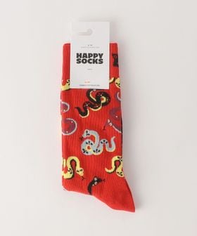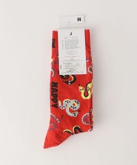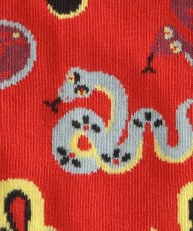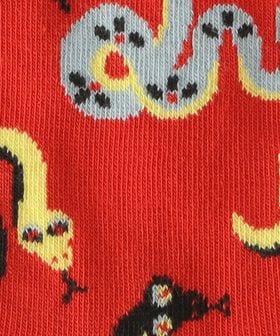 鮮やかなレッドをベースに、ヘビ柄がイラストされたクルー丈ソックス。