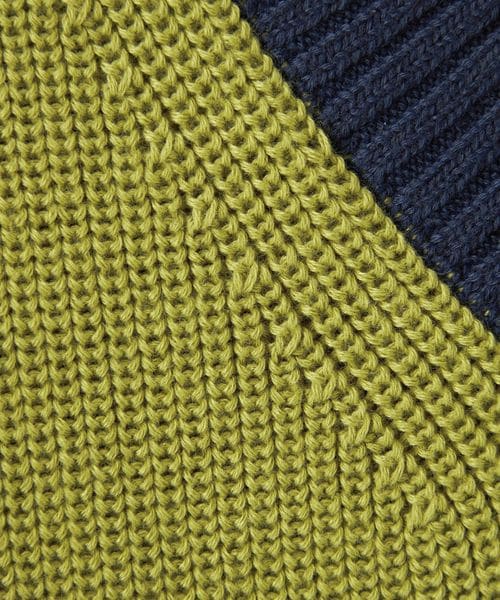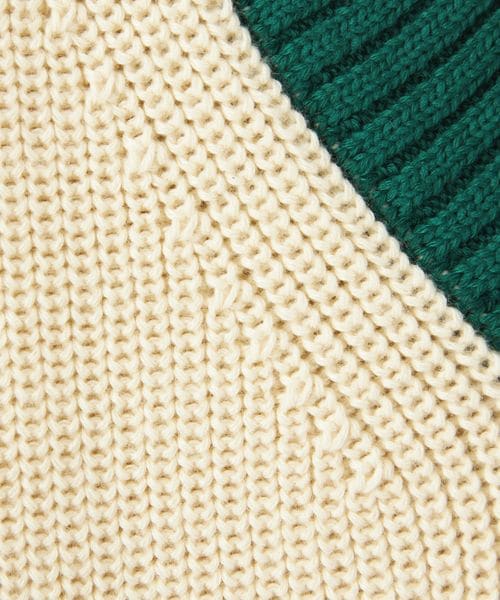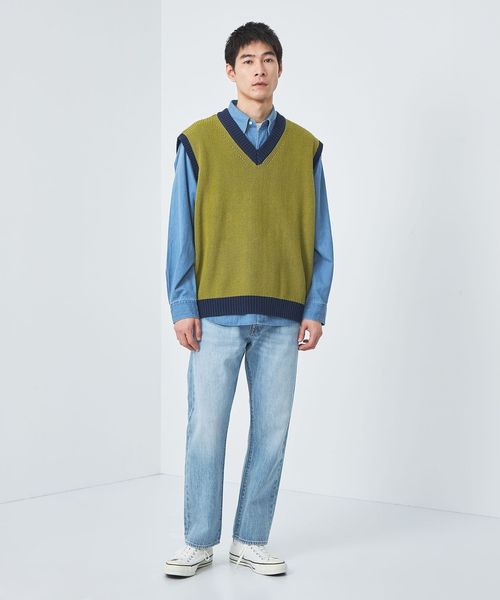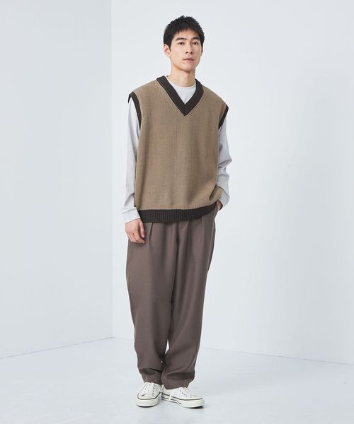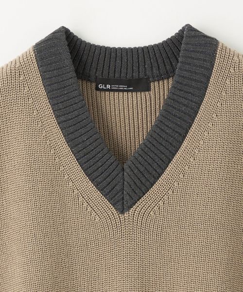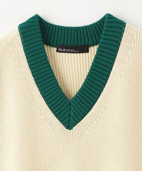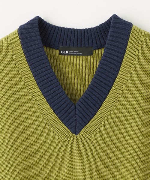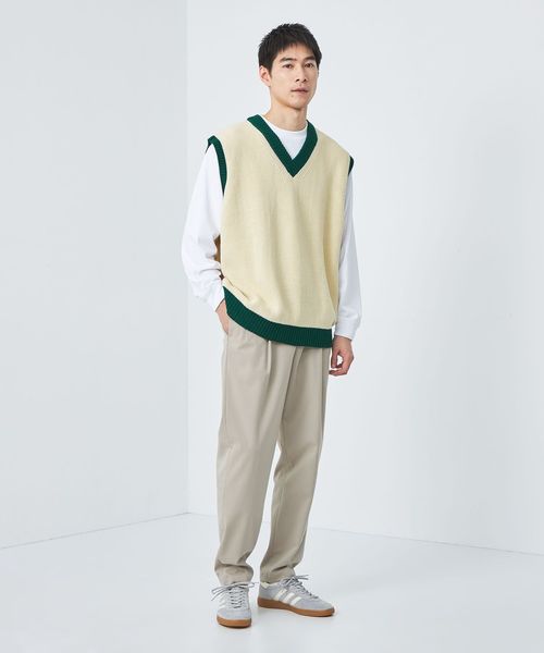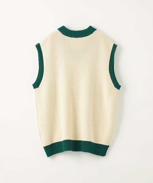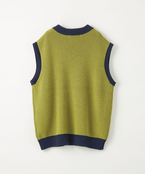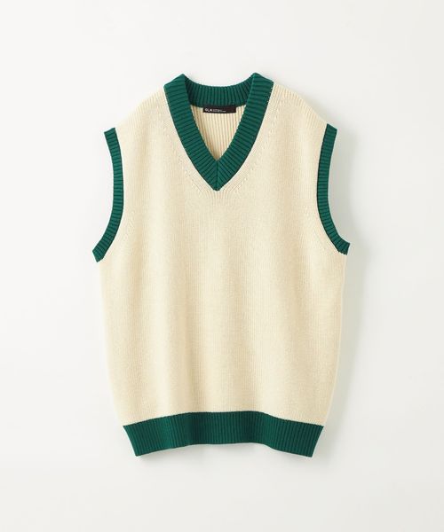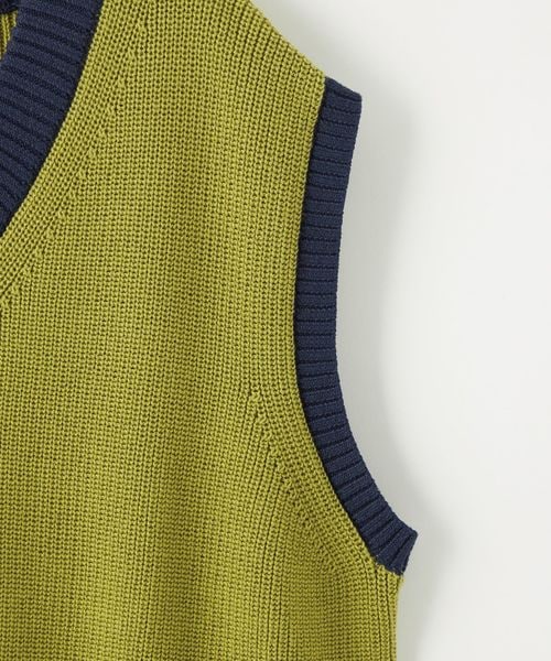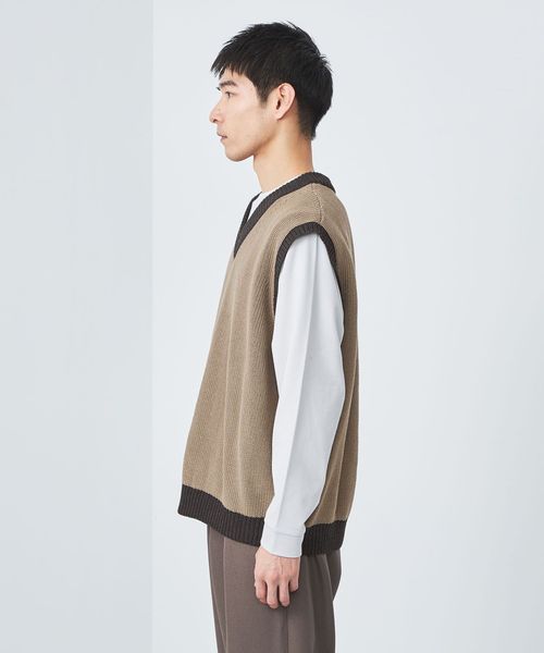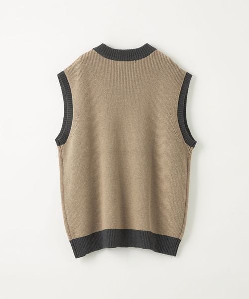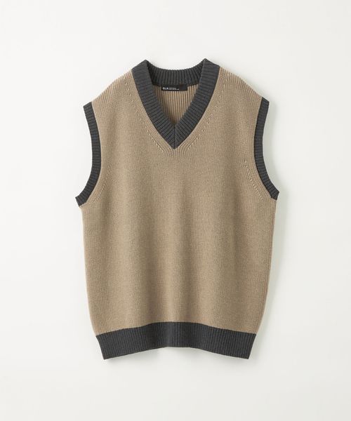 襟や裾、アームホールのリブ部分がデザインポイントのベスト。