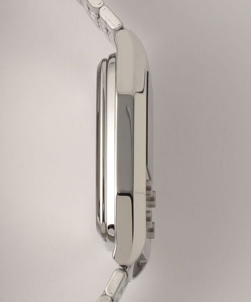 ヘアラインとミラーで丁寧に磨き分けされたケース、メタル素材のアイコニックなフロントボタンで上質に仕上げました。
