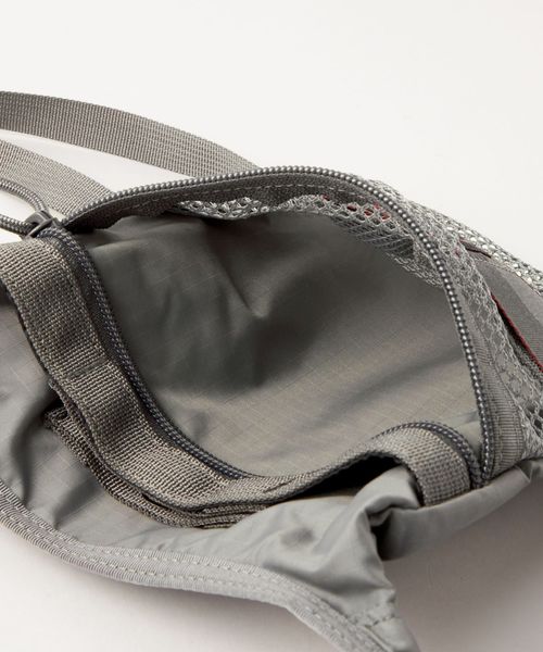 メッシュ生地を使用した引手のあるジップ付きポケットをフロントに配置しました。