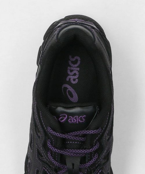<NEEDLES>らしいブラック×パープルのカラーリングに、トラックパンツのデザインを彷彿させる5本ラインのアシックスストライプが特徴的。