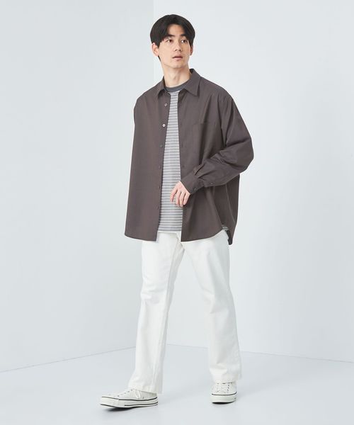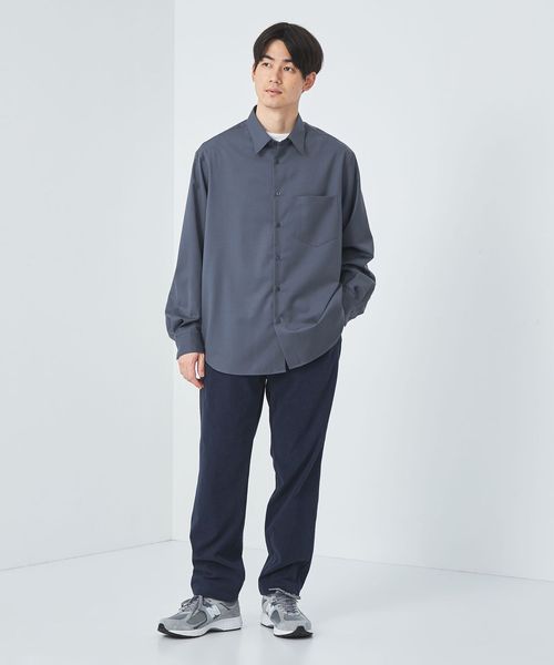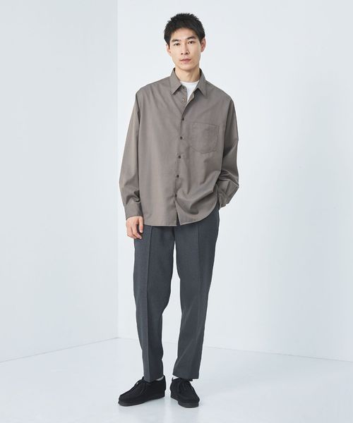 ゆったりとしたシルエットのシャツなので、ワイドテーパードなどのクリーンでワイドなシルエットのパンツがおすすめ。