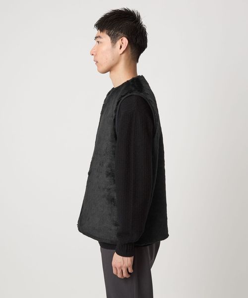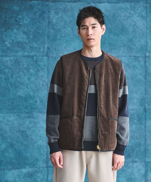 フェイクファー生地とコーデュロイ生地の2面で楽しめるデザインで別注したリバーシブルベスト。