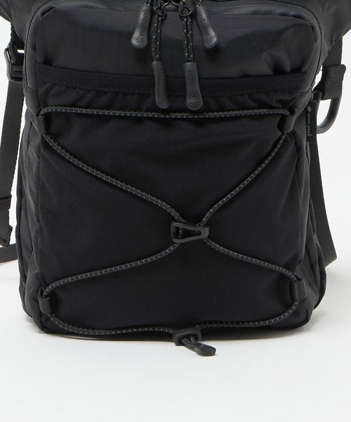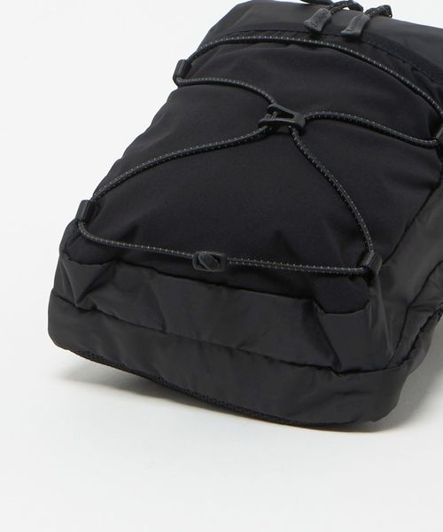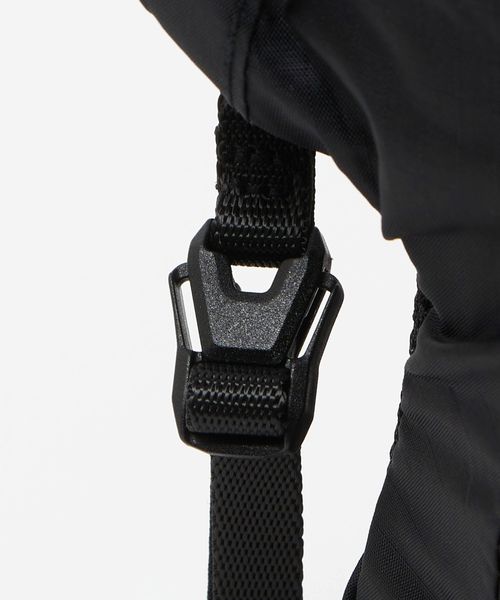 メイン収納部に加えてフロントファスナーポケットを配置し、その上にウィンドブレーカーやキャップなどを脱いだときに挟み込めるゴム紐をあしらいました。