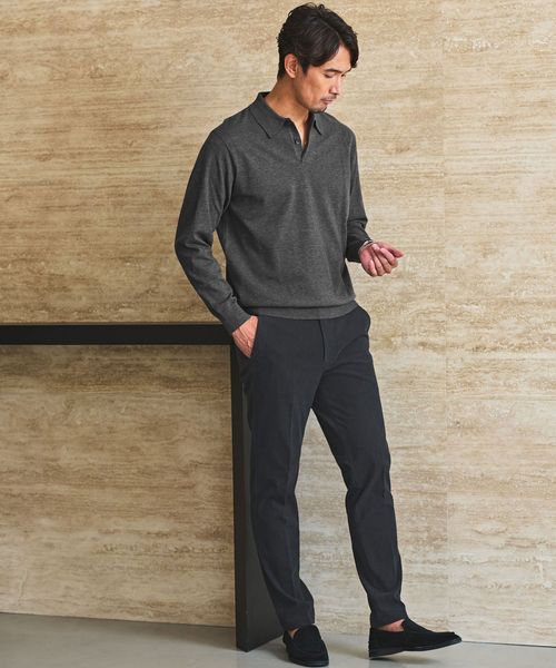 すっきりとしたシルエットのアイテムや、品のあるレザーシューズと合わせると、知的でスマートな着こなしに仕上がります。
