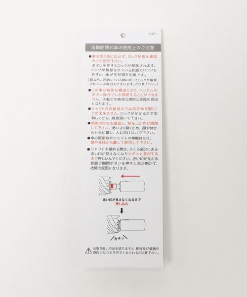 一般的な自動開閉式折りたたみ傘はシャフトを縮める際、一気に押し込まなければスプリングの力で押し戻されてしまいますが、この傘の特徴的な構造により押し戻されることなく少しずつ段階的に収納でき安全にご使用いただけます。