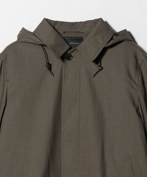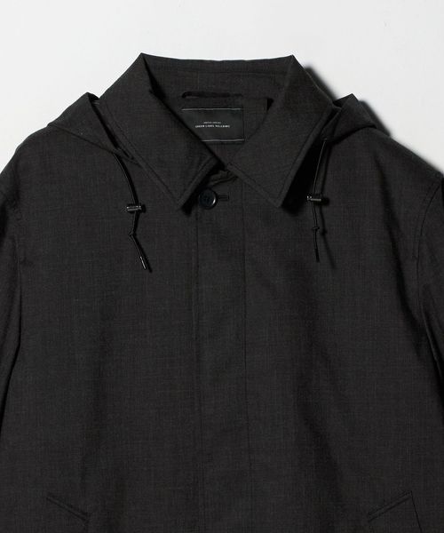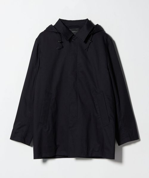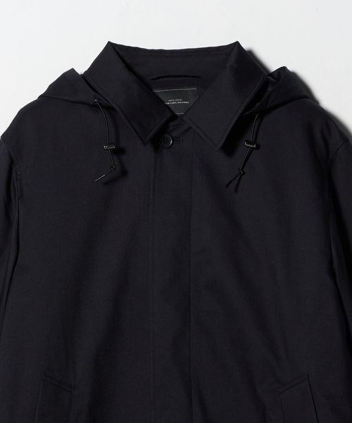 ミドル丈でフードの取り外しが可能なバルカラー型コート。