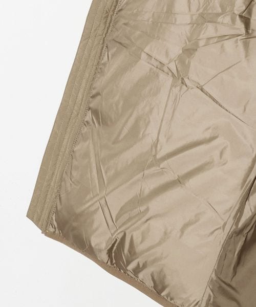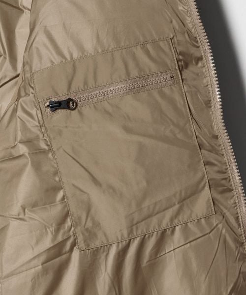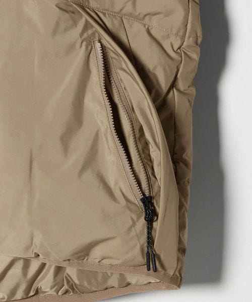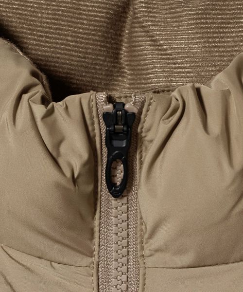 撥水加工を施した意匠性が高いメモリーポリエステル素材を採用し、保温性のある中綿を封じ込めたインサレーションベスト。