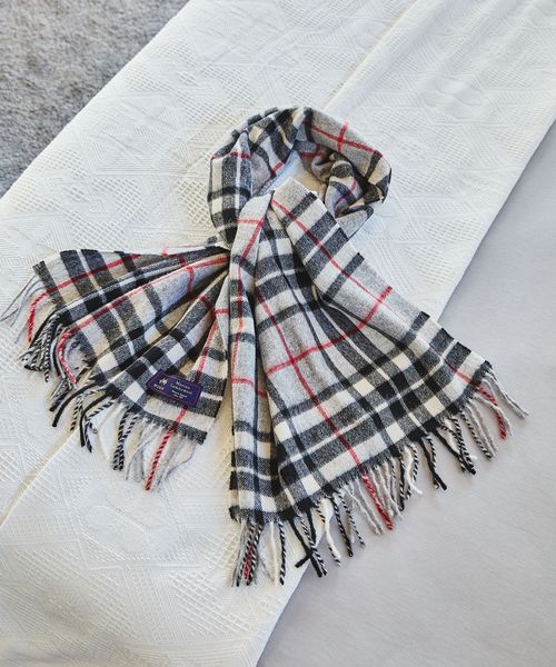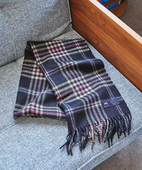 スタイリングに映えるチェック柄の大判マフラー。