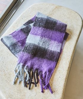 トレンド感のあるブラッシュドマフラーからブロックチェック柄が登場
