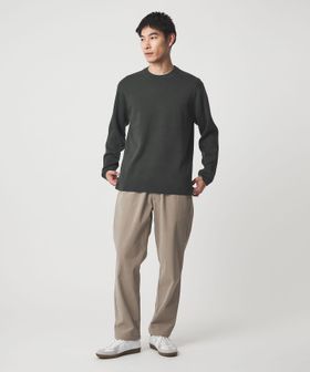 クリーン見えするニットなので、起毛感のあるウールパンツやコーデュロイ素材のボトムスと合わせると抜け感のある着こなしに。