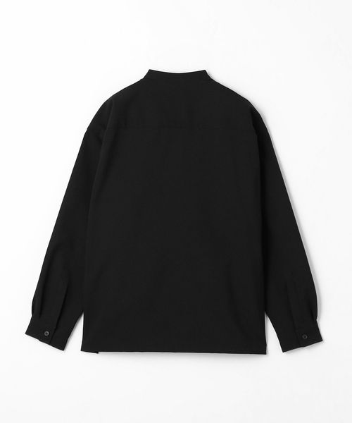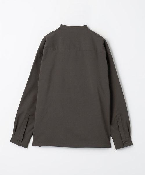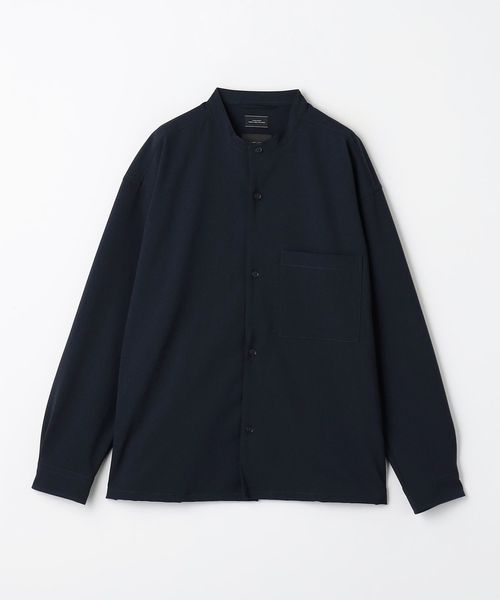裾スクエアデザインで仕上げたバンドカラーシャツ。