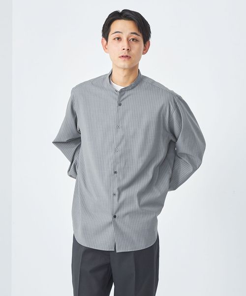 ウォッシャブルトロ ストライプ ジャストルーズ バンドカラー シャツ ―ストレッチ・防シワ―
