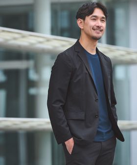 ジャケットやカーディガンなどのインナー&一枚着としてデイリーに着られるジャケットネックTシャツ。