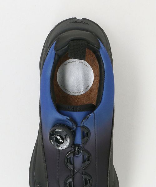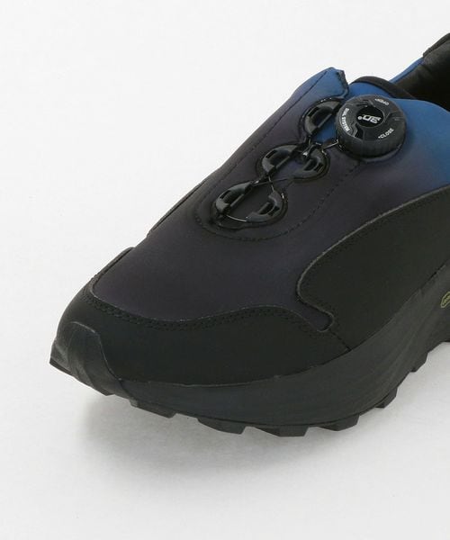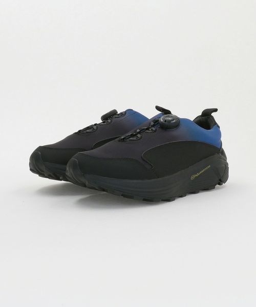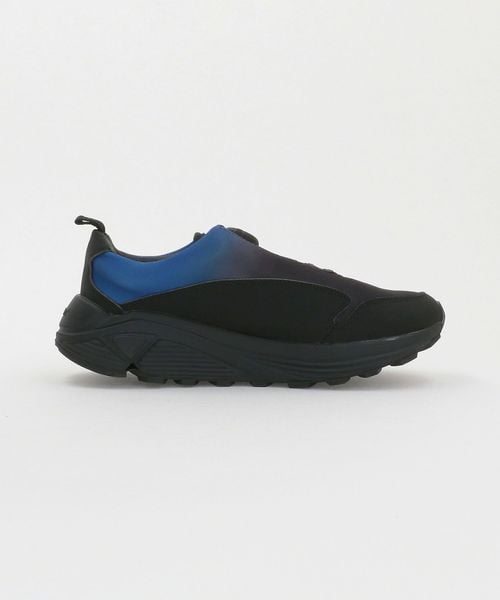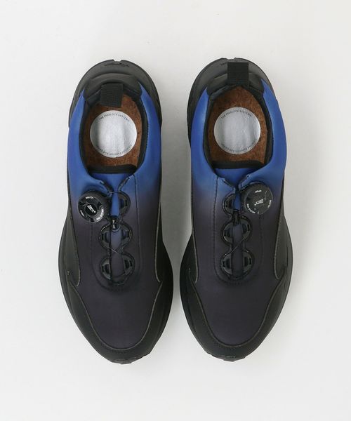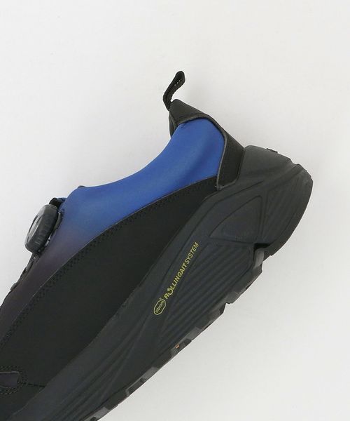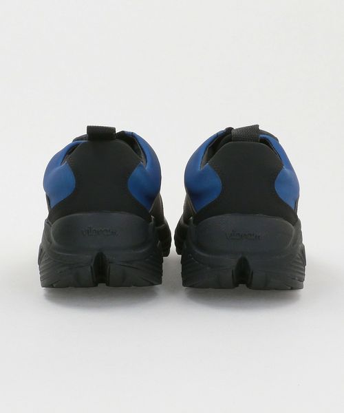 動くたびにパンツ裾からちらっと覗くブルーがアクセントになり、ただのブラックシューズではない趣のある一足です。