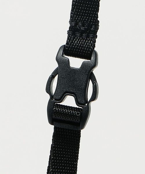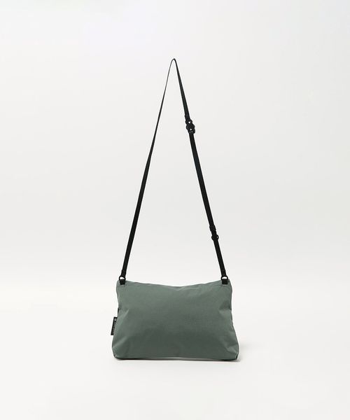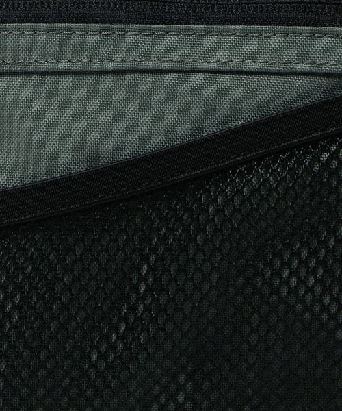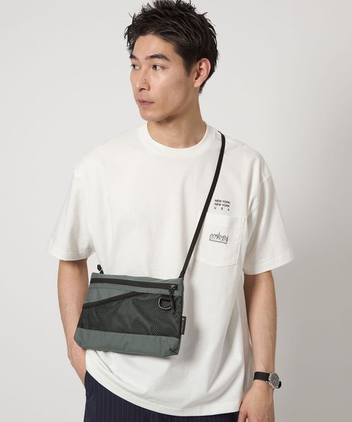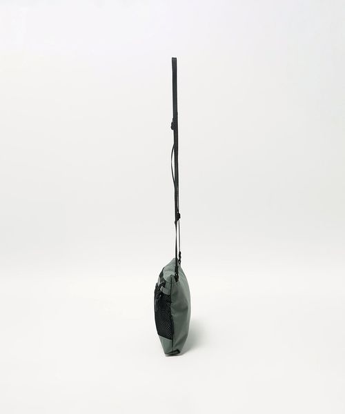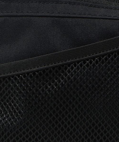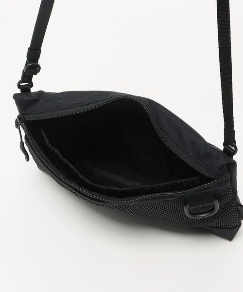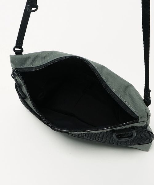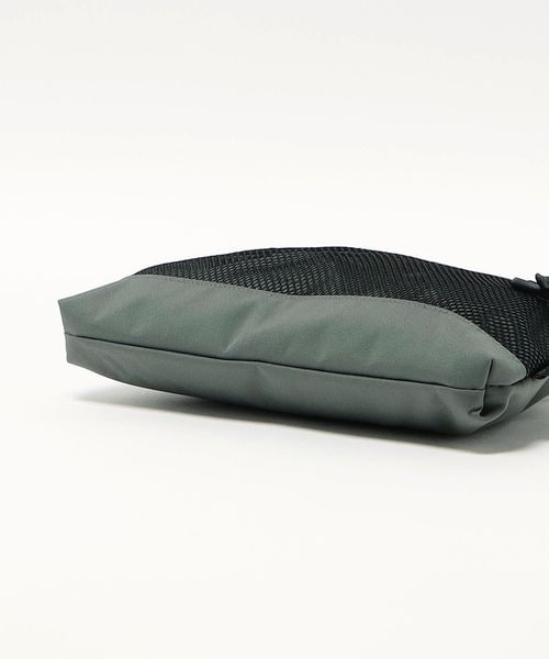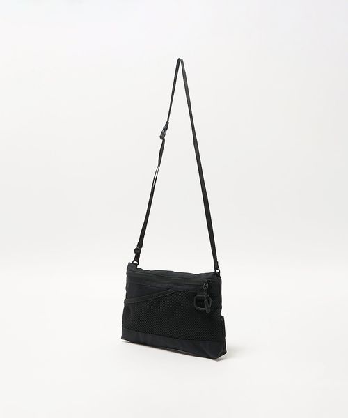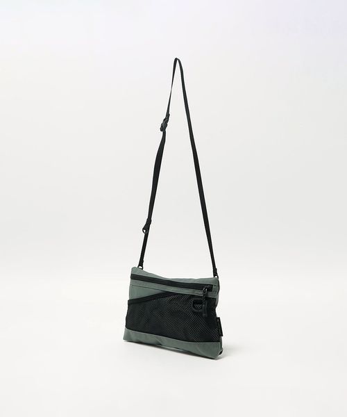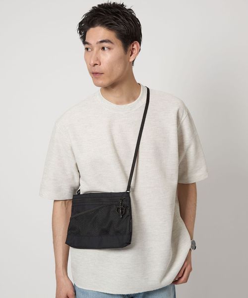 表地とファスナーの素材を変更したサコッシュし、フロントのメッシュポケットが、デザインアクセントの役割も担うディテールに。