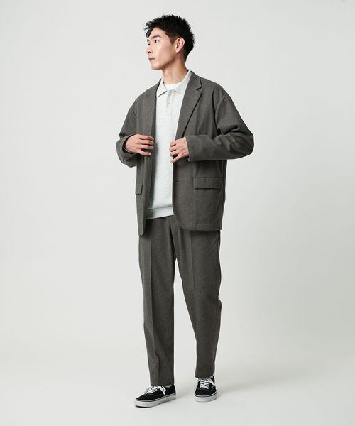 同素材を使用したパンツを合わせたセットアップスタイルがおすすめです。