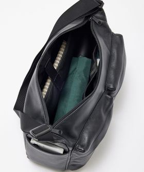 カジュアルなデザインのショルダーバッグが、レザー素材を使用し上品な雰囲気でアップデート。