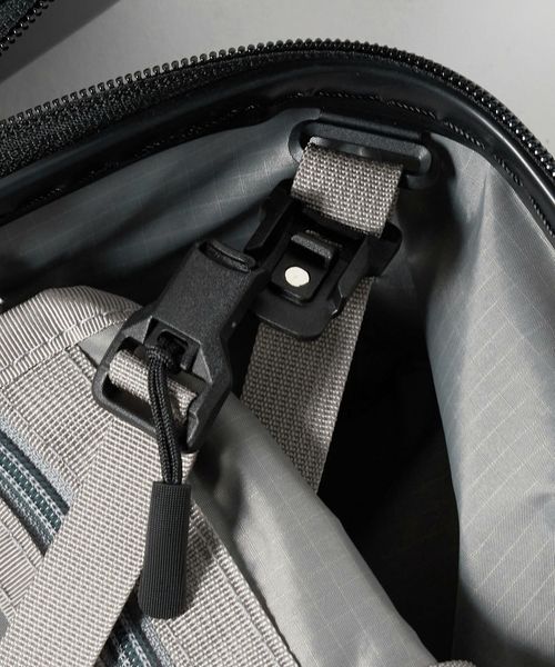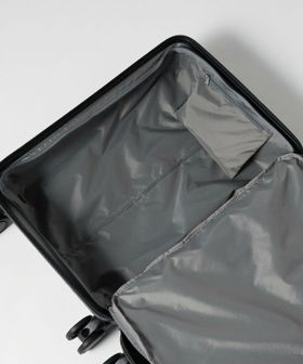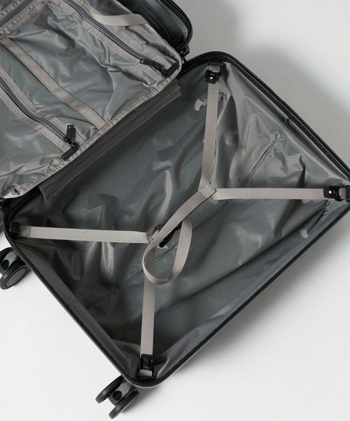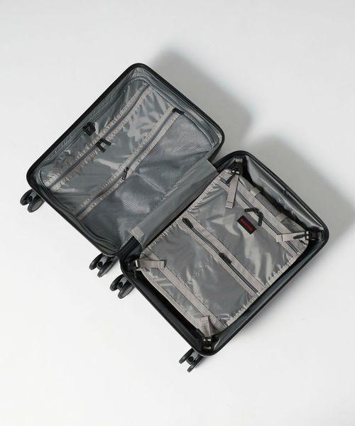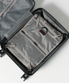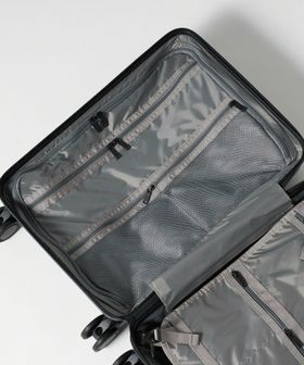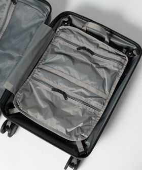 ・中面には収納アイテムの視認性に優れるメッシュポケットのほか、滞在先のホテルウォールポケットとして使用できる仕切り板を搭載。