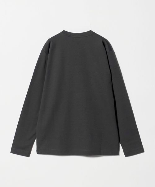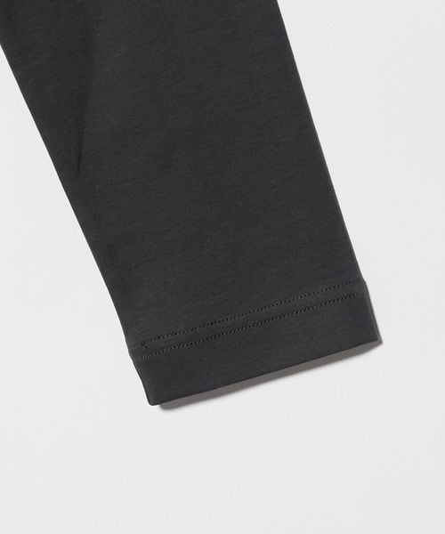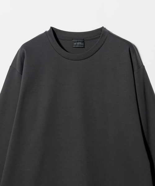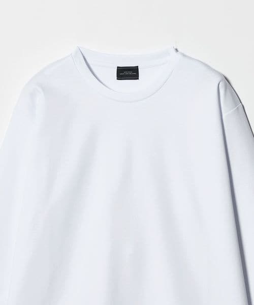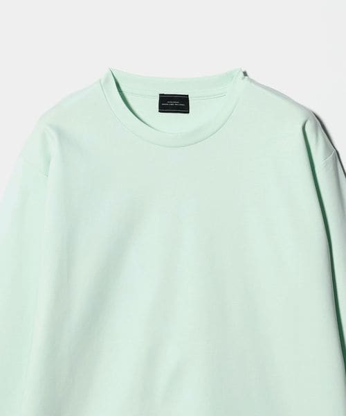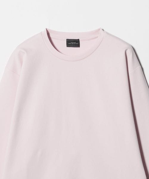 ネックは共地で細めに設定し、袖口はリブ無しの折り返し仕様でミニマル見た目に。