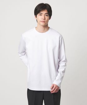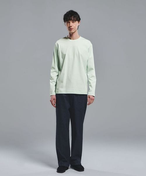 ネックは共地で細めに設定し、袖口はリブ無しの折り返し仕様でミニマル見た目に。