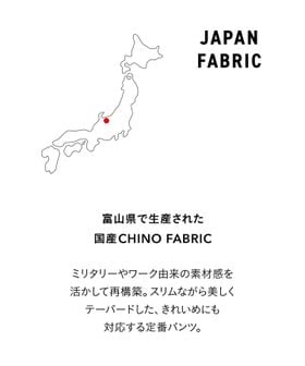 チノパンのルーツであるミリタリーやワークウェアらしいコットンポリエステル素材を使用。