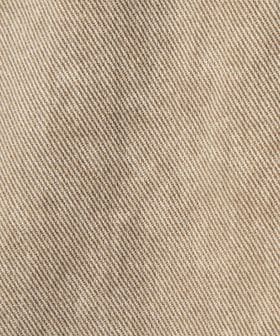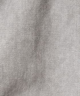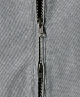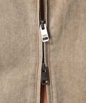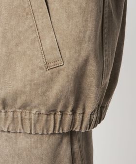 ウォッシュ加工風のプリントの入った素材を、さらに洗いであたりを出すことで強めの加工感に仕上げました。