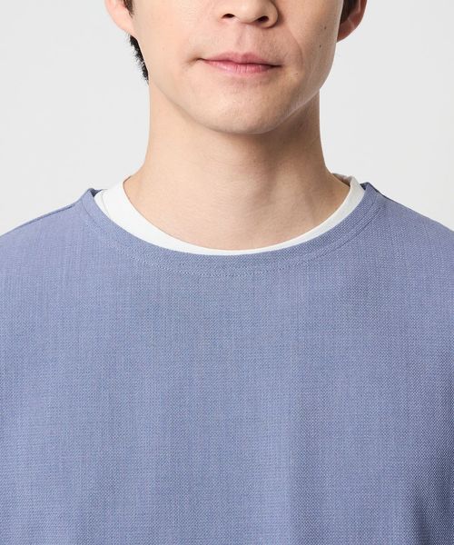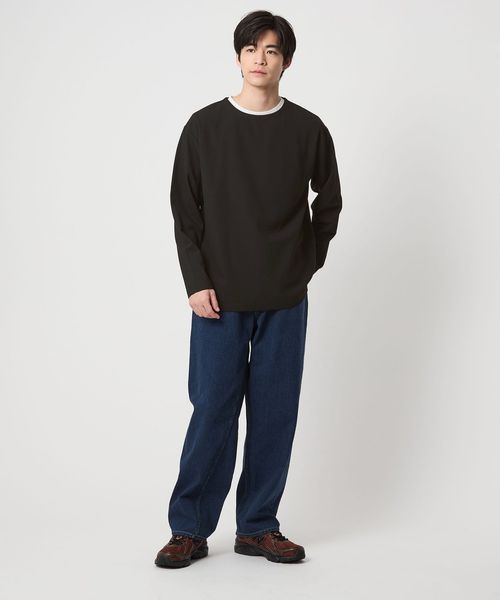 クルーネックカットソーをインナーに取り入れて襟元から覗かせた着こなしがおすすめです。