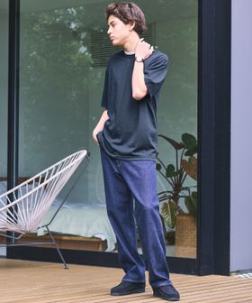 速乾性のあるポリエステルと風合いのよいコットンを混紡した、ニット素材の半袖Tシャツ。