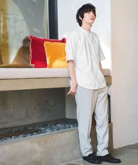 防シワ加工特有のばりっとした風合いを軽減するため、セルロースを混紡しやわらかな肌触りを表現しています。