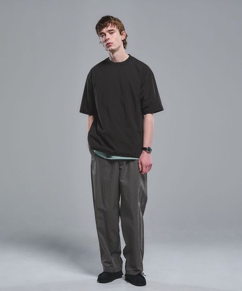 タック入りのイージーパンツを合わせるとキレイめカジュアルな装いに仕上がります。