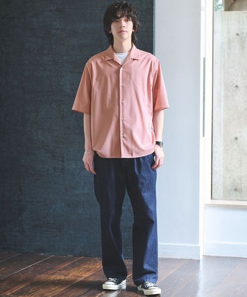 クリーンな印象に仕上げたオープンカラーシャツ。