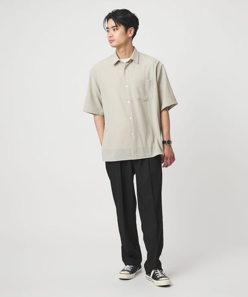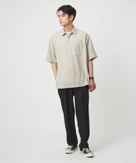 同素材を使用したシャツと合わせたセットアップスタイルも◎。